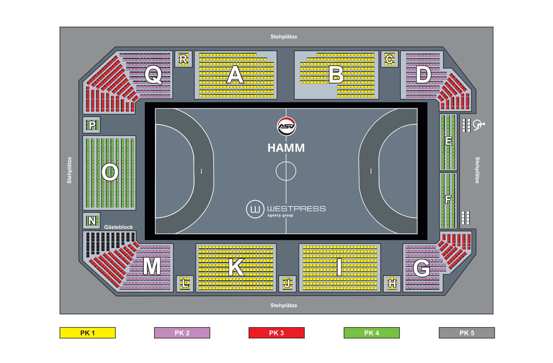 Der Gästeblock in der WESTPRESS arena befindet sich in Block M. Bitte beachtet: Trommeln und andere Fanaktionen sind ausschließlich im Gästeblock im schwarz markierten Bereich erlaubt (siehe Saalplan).