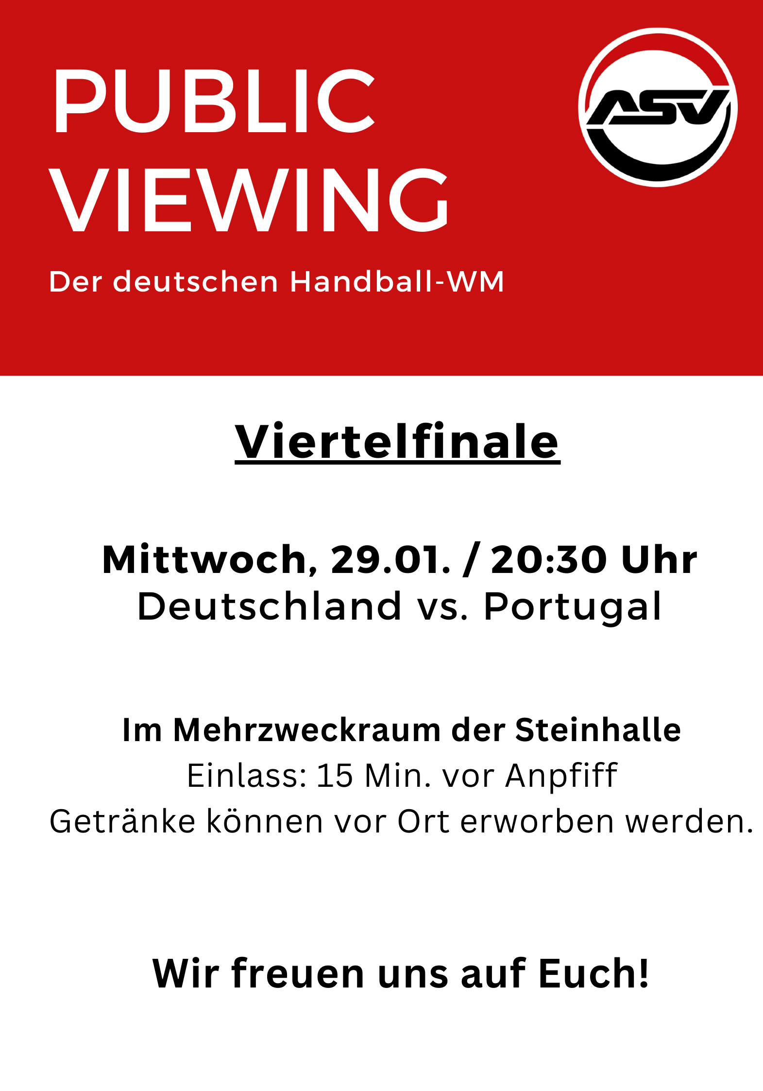 Am morgigen Mittwochabend (29.01.25) trifft die deutsche Handball-Nationalmannschaft um 20:30 Uhr auf den Viertelfinal-Gegner Portugal. Falls Du Lust hast, das Spiel in geselliger Atmosphäre zu schauen, bist Du beim Public Viewing im Mehrzweckraum an der Steinsporthalle genau richtig. Der Mehrzweckraum ist bereits 15 Minuten vor Anwurf geöffnet.