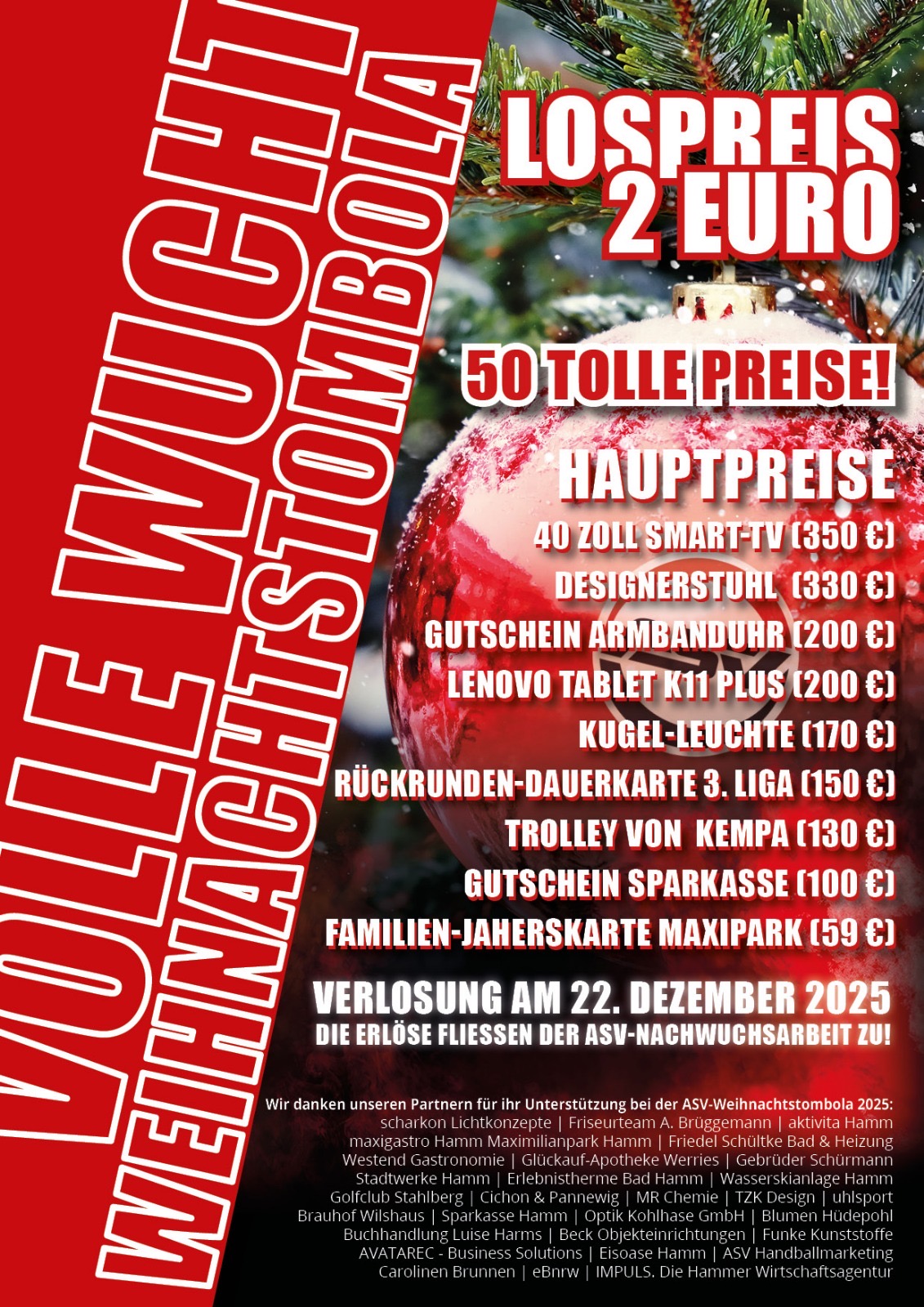 In diesem Jahr möchten wir Euch in der Vorweihnachtszeit mit einer besonderen Aktion überraschen: Der ASV Hamm-Westfalen e.V. veranstaltet in diesem Jahr eine Weihnachts-Tombola mit vielen attraktiven Preisen, die uns von unseren Sponsoren zur Verfügung gestellt wurden. Dafür bedanken wir uns recht herzlich bei unseren großzügigen Sponsoren!